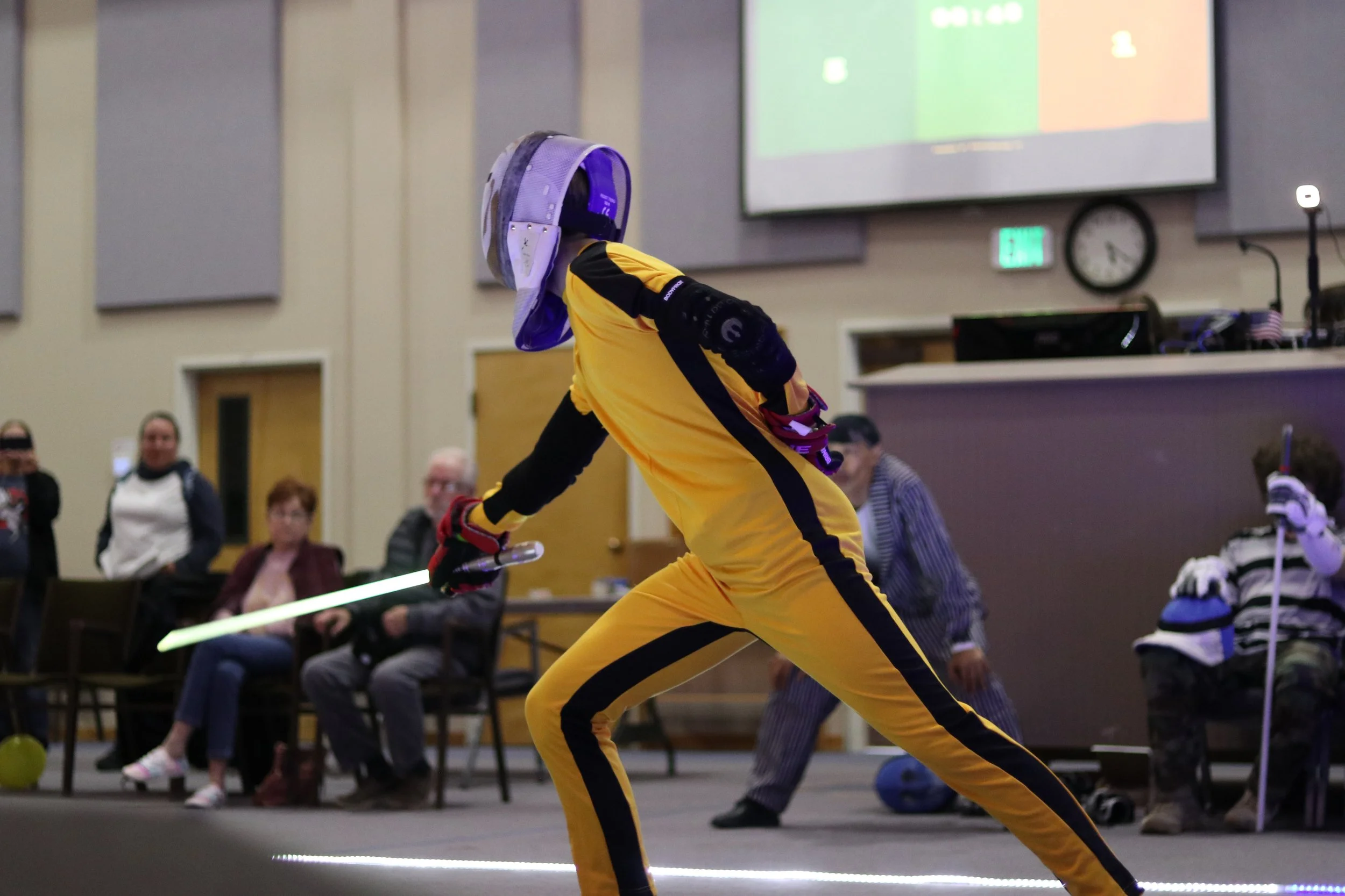 Excellent cosplay also made an appearance. Dinah Kolasa dazzled as Sally from Nightmare Before Christmas, with long flowing red hair eerily flowing from her mask. Tony dressed as Jack Skellington and would often exclaim, “What’s this!” to amuse the crowd. Josiah Kupitz donned the Bruce Lee yellow track suit, which seemed appropriate given his agility. Ally Fournier sported a pink skirt with matching saber and leg warmers. Sean Holtzman strutted around the ring in a tartan Irish kilt. Travis Pace impressed in a jacket styled after the apparel worn by Connor Kenway, an infamous Revolutionary War assassin.